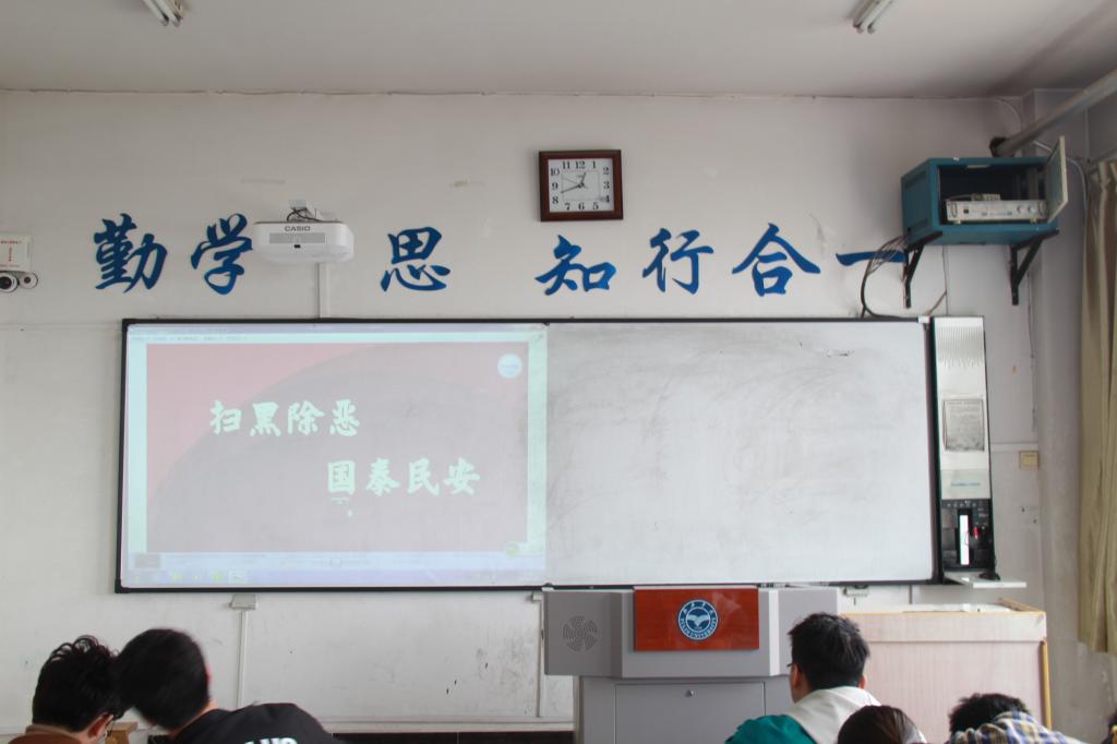 为营造良好的法制教育环境和氛围,教育学生树立良好的法律意识,共建和谐安全校园,3月25日下午17:00,我院在四号教学楼604教室组织开展“扫黑除恶,国泰民安”主题宣传教育活动,全体大一学生参加了此次活动。