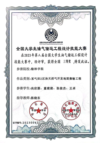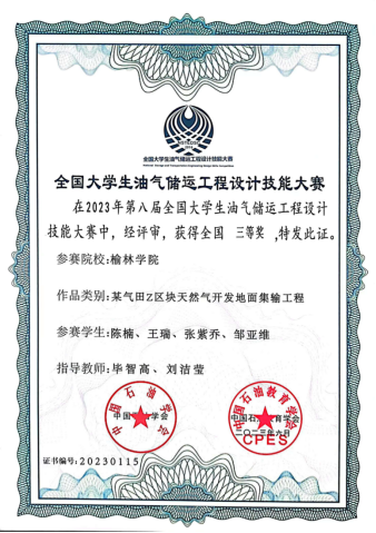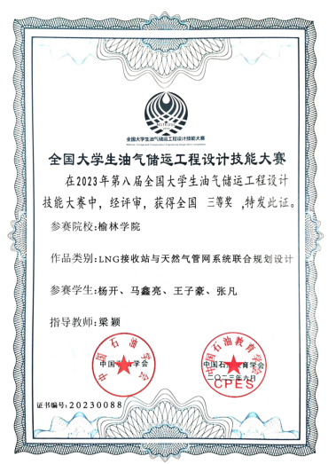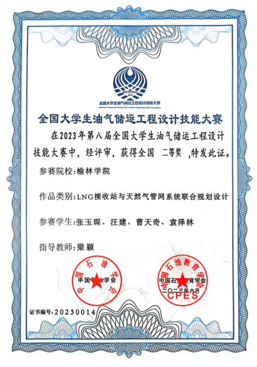 本届大赛赛题分为LNG接收站与天然气管网系统联合规划设计和某气田Z区块天然气开发地面集输工程两个,共有来自32所高校,166件作品参加全国比赛,其中66份作品进入推荐决赛名单。一直以来学院高度重视学生科技创新工作,通过学科竞赛,培养学生工程创新意识、开拓学生视野,提高学生运用油气储运工程专业知识综合应用能力。本次大赛通过专家线上评审和线下答辩的方式,我院油气储运工程专业学生张玉琛、汪建、曹天奇、袁泽林同学方案设计作品荣获全国二等奖,尚欣源、董建建、张俊杰和王卓等同学荣获全国三等奖三项,成功参赛奖三项。