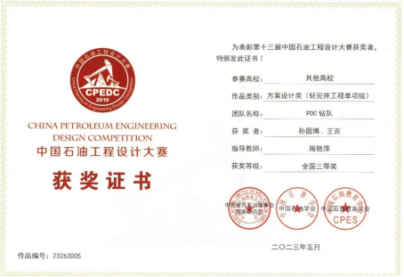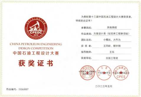 在校团委和院领导关心和大力支持下,石油工程专业教研室经过赛前宣传动员、比赛报名、作品提交、审核答辩等层层选拔,此次大赛方案设计类比赛中,我校石油工程专业学生陈嘉木、高鑫宇同学方案设计作品荣获全国二等奖,郭宇翔、王同龄、王吉和孙圆博等同学荣获全国三等奖二项,全国鼓励奖三项;曹皓亮、刘凯歌、王文静、张琪获得知识竞赛优胜奖。