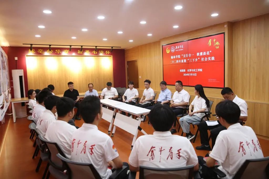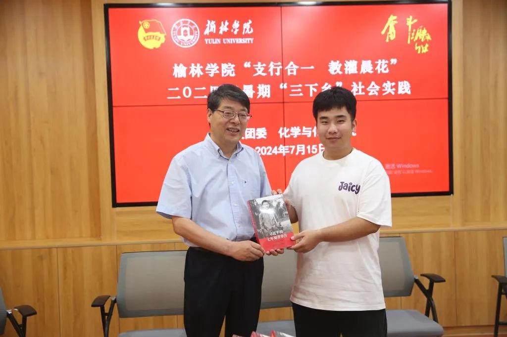 在与暑期“三下乡”实践团师生座谈会上,张新柱向建榆路社区授予了太阳集团2138大学生社会实践基地,为每一位参与“三下乡”社会实践的学生赠予《习近平七年知青岁月》一书并合影,他强调同学们要从书中感悟梁家河的大学问,认真学习习近平总书记扎根群众的为民情怀、持之以恒的奋斗精神、勤劳务实、吃苦耐劳的工作作风和一心一意为人民服务的人生目标。实践团的同学们依次分享了自己在此次暑期“三下乡”社会实践活动中的收获与感悟,同学们表示通过深入基层社区一线的社会实践,他们更加深刻认识到自己在知识、能力和综合素质等方面的欠缺和不足,更好地锻炼和培养了他们的团队协调、综合处理能力,为今后的学习和工作指明了方向。张新柱听后欣慰的表示,通过近几年学校追赶超越和“五乐育人”等工作的开展,学校的整体面貌和学生的综合素养都有了显著提升,未来学校将持续强化“五乐育人”工程,大力开展现代产业学院建设,围绕榆林及周边产业及社会发展的实际需求培养“红专并进 理实交融”的高素质应用型人才。