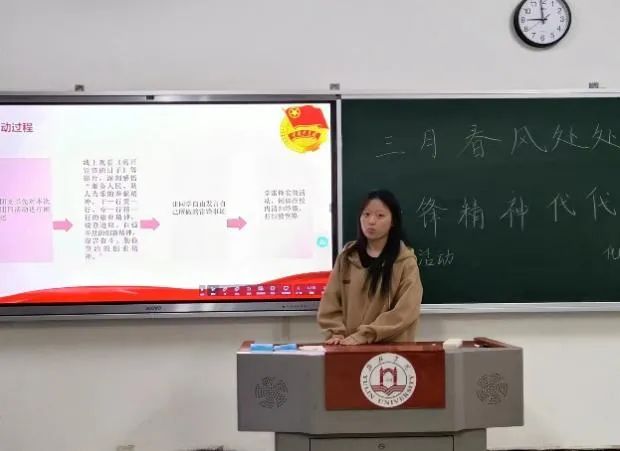 各班团支书主要围绕各班团日活动开展情况进行总结汇报,通过精心制作的PPT和视频资料,生动展示了各自团支部在雷锋月期间日常学习和生活中开展的活动以及如何积极践行雷锋精神,让各班同学了解活动目的与意义,引导同学们了解雷锋,学习雷锋,发扬雷锋精神。
