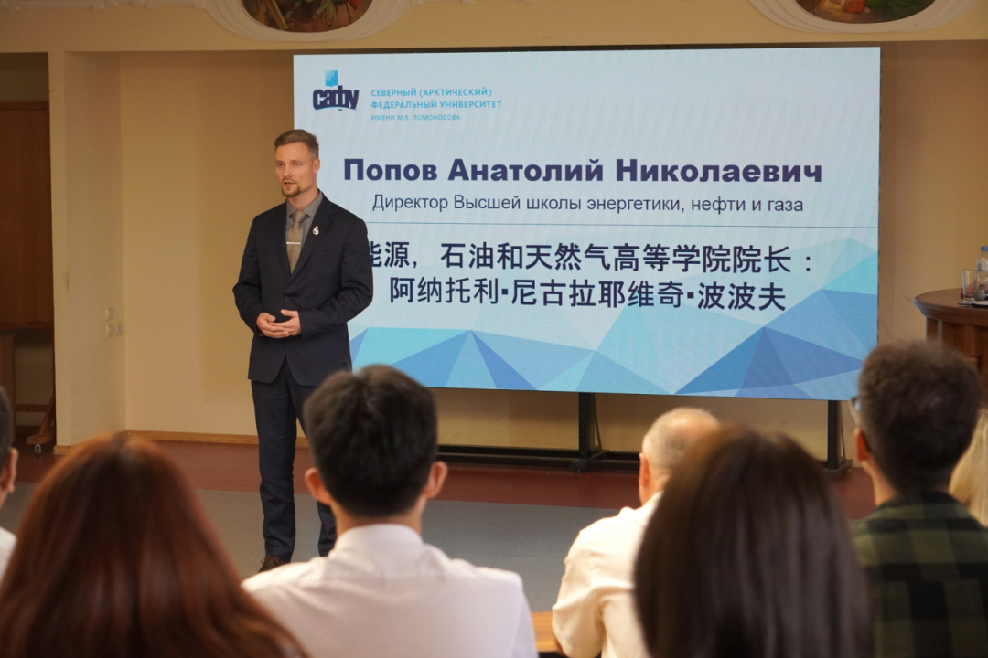 能源石油天然气学院院长阿纳托利·尼古拉耶维奇·波波夫向学生赠送了礼品和学院徽标并强调,本学期对于同学们来说是不轻松的,但是非常有意思的,因为这一年是大家成为石油天然气领域第一批参与国际项目可能性的关键时期,我看见徽标很多学生都别在衣服上了,在俄罗斯罗蒙诺索夫北方(北极)联邦大学,这枚徽章将代表你们是能源石油天然气学院一员的标志。8月20号(星期二),在太阳集团2138任教过的俄语课程奥利加教师将开始对大家进行俄语强化课程学习,她让同学们分享在抵达阿尔汉格尔斯克的第一印象。