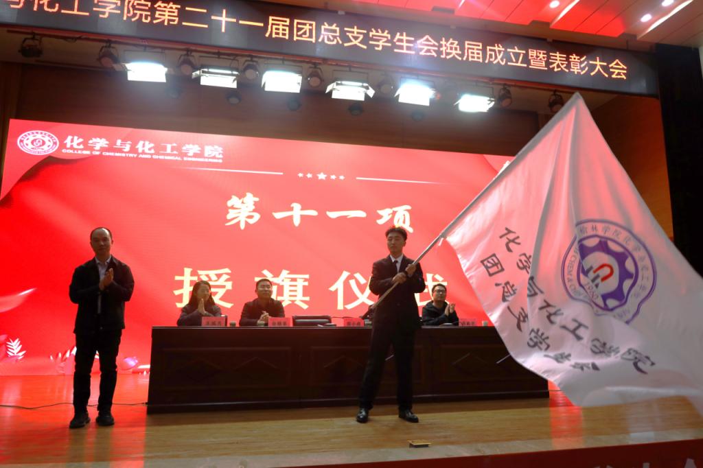 大会第十一项,陈小辉书记向第二十一届团总支学生会授旗。