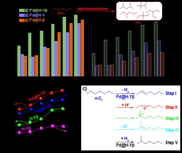具体地,以正庚烷(n-C7)为模型化合物,研究其在Pd@H-Yβ上的催化加氢异构化反应过程。研究团队制备了负载量仅为0.2wt%的Pd@H-Yβ,在280℃和1 MPa氢压下,对n-C7进行加氢异构催化过程进行评价,异构烷烃(i-C7)的产率达到了74.7%,远超于传统的i-C7产率(Pd@H-Y为49.1%,Pd@H-β为33.7%)。