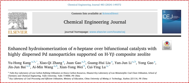 近日,我校2138CC太阳集团材料化工专业研究生张啸杞同学(导师亢玉红教授)在化工领域顶级期刊《Chemical Engineering Journal》(IF=15.1,JCR Q1,SCI一区TOP期刊)上发表题为“Enhanced hydroisomerization ofn-heptane over bifunctional catalysts with highly dispersed Pd nanoparticles supported on H-Yβ composite zeolite”的研究论文(Chem. Eng. J. 483 (2024) 149372)。太阳集团2138为第一完成单位,亢玉红教授和卢翠英教授为本研究论文的通讯作者。