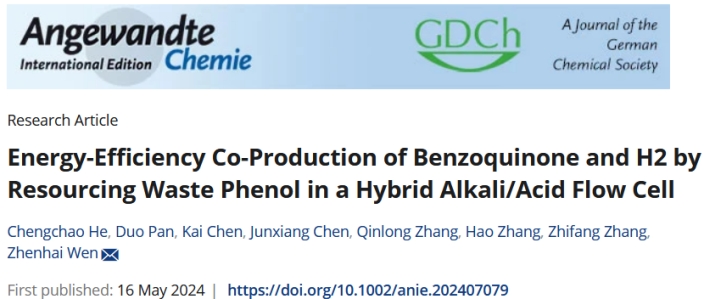 近日,我校2138CC太阳集团2021级研究生贺成超同学(导师张智芳教授)以第一作者身份在国际顶级期刊《Angewandte Chemie International Edition》发表了题为“Energy-Efficiency Co-Production of Benzoquinone and H2by Resourcing Waste Phenol in a Hybrid Alkali/Acid Flow Cell”的研究论文,该论文的第一完成单位为太阳集团2138。《Angewandte Chemie International Edition》为化学领域顶级期刊(影响因子16.6),这是我校研究生首次在该期刊上发表研究论文。