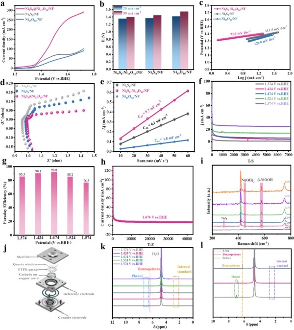 图2.Ni9S8-Ni15O16在阳极苯酚氧化过程中的电催化性能。(a)不同催化剂在1 M KOH和5 mM苯酚中的苯酚阳极氧化活性(未IR补偿);扫描速率:2 mVs-1;(b)不同催化剂时苯酚阳极氧化过电位(20 mA cm-2和50 mA cm-2);(c)由(a)中的LSV曲线导出的电催化剂在阳极苯酚氧化的塔菲尔图;(d)不同催化剂在阳极的奈奎斯特图(未IR补偿);(e)不同催化剂的Cdl;(f)不同电位下Ni9S8-Ni15O16电化学氧化苯酚的稳定性实验;(g)不同电位下苯醌生产的法拉第效率图;(h)Ni9S8-Ni15O16在1.474 Vvs.RHE条件下阳极氧化的稳定性实验;(i)不同外加电位下Ni9S8-Ni15O16的原位拉曼光谱图;(j)原位拉曼测试池结构示意图;(k)不同电位下Ni9S8-Ni15O16将苯酚(蓝色)为苯醌(红色)的1H核磁共振光谱图;(l)苯酚(绿色)氧化为苯醌(橙色)的1H核磁共振光谱图。DMSO为内标(浅紫色)。