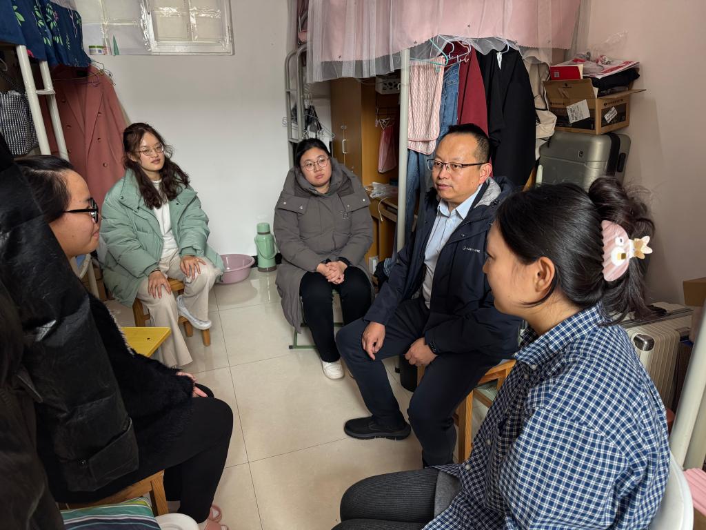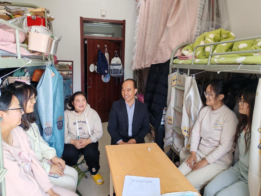 教师发展中心主任刘泽惠来到本科生新生6-310宿舍,详细了解每位同学的家庭情况、学习生活等。建议同学们要认真阅读《平凡的世界》,从中汲取精神力量,树立长远目标并转化为实际行动,争取早日实现自己的理想抱负。建议同学们及早规划自己的大学生活,践行“五乐”育人理念,积极参加校园文化活动,培养广泛的兴趣爱好,成为一个有情怀、有情趣的人。