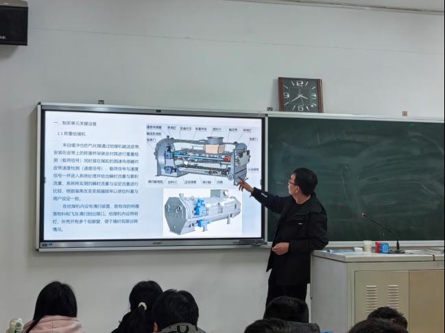 王占鹏经理以“德士古煤气化中的关键设备”为主题,结合精益化工煤气化工艺和自身工作经验,通过对关键设备的组成结构、工艺原理、故障特征、安全运行的精彩讲解,不仅让学生全面学习了煤气化工段关键设备的运行情况,更使过控专业教师对自身工作内容和职责有了更深刻的认知。整个课堂气氛热烈,学生们积极提问,并与专家进行了深入的交流和互动。课后,王占鹏就当前最先进的煤化工装备在榆林的应用情况和存在的问题与过控教研室的教师进行了深入交流和探讨,就合作编著教材达成意向。