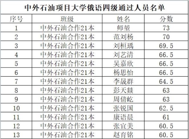 近日,2023年全国大学俄语四级考试成绩揭晓,我校首届中外石油合作项目学生成绩喜人,俄语四级通过率为46%。