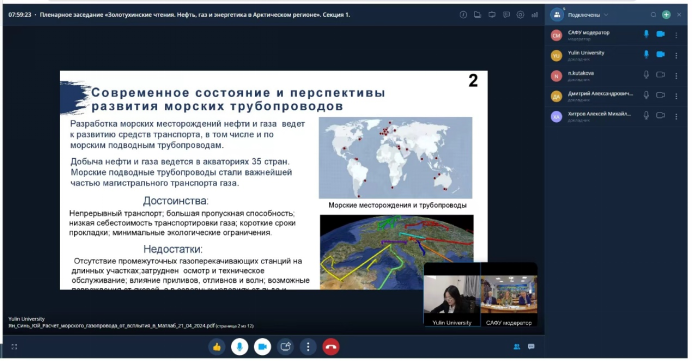 杨欣雨同学用俄语做了《Расчёт толщины́ бетонного покрытия морско́го газопрово́да против всплытия в Матлаб》(用Matlab计算海上天然气管道混凝土涂层的厚度以防重铺)的学术报告,受到了俄方的一致好评。