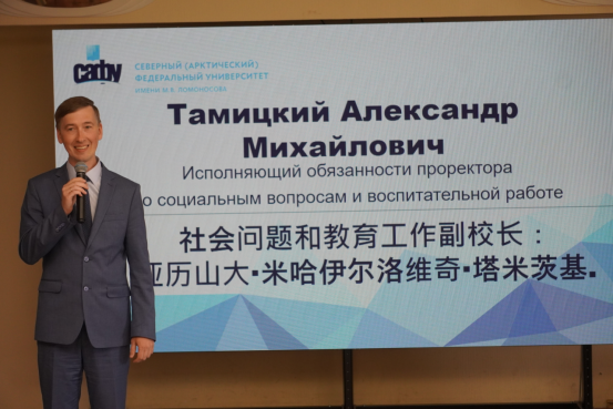 北方(北极)联邦大学负责社会问题与教学工作的副校长亚历山大·米哈伊尔洛维奇·塔米茨基和同学们交流