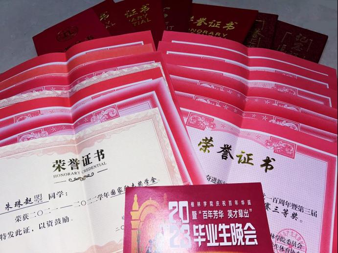 2021至2022学年凭优异成绩获国家励志奖学金,2022至2023年度获三等奖学金,与团队在第九届“互联网+”全国大学生创新创业大赛中获省级银奖,与团队在2023年陕西省大学生街舞锦标赛中获得优异成绩,在陕西省第十七届运动会开幕式进行演出,2023届毕业生晚会主持,2022届毕业晚会优秀表演者,2022年外国语学院线上线下两次配音大赛中获得二等奖,第一届俄语书法大赛三等奖,第三届大学生羽毛球比赛获得团体三等奖,第四届大学生羽毛球联赛获得团体赛季军,第十七届太阳集团2138校园歌手大赛非专业组二等奖,首届2138CC太阳集团歌手大赛一等奖,带领化工院啦啦队在啦啦操比赛中获最佳表演奖,第八届“天丰昌”校友杯篮球赛开幕式优秀演职人员。