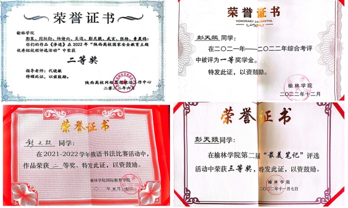 刚上大学时,彭天燚面对与高中时期截然不同的大学生活,没有明确的目标,也没有自己的人生规划,但是他的父母朋友都告诉他不要荒废度日,要让自己的大学生活变得有意义。之后,在老师的指导帮助下,他慢慢找到了自己的奋斗方向,端正了自己的学习态度。终于获得了学校一等奖学金。他的勤奋和毅力赢得了老师和同学们的一致好评。而他加入学生会工作的经历,更是让他体验到了团队合作的重要性。在学生会工作中,彭天燚不仅负责策划和组织各种活动,还积极参与各种事务。他们参加了陕西高校国家安全教育主题优秀短视频活动,并且荣获二等奖。这个经历让彭天燚明白了团队合作和创意的重要性。