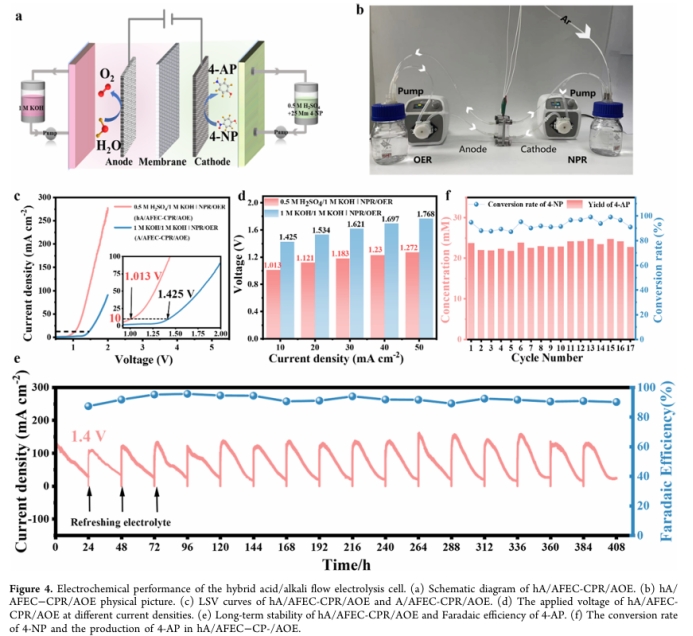 研究开发了一种具有双原子Ni–Cu位点的高效低成本电催化剂(NiCu-NC),通过协同离子交换与高温退火策略构筑而成。在酸性介质中,该催化剂对4-硝基苯酚(4-NP)展现出优异的电还原性能,在-0.04 Vvs.RHE的低电位下实现了超过95%的法拉第效率,其高活性源于Ni和Cu双位点之间的协同效应。进一步构建的混合酸/碱流动电解池,将NiCu-NC阴极与商业阳极材料耦合,可稳定运行超过400小时且几乎无性能衰减,充分展现出其优异的耐酸性和长期运行能力。
